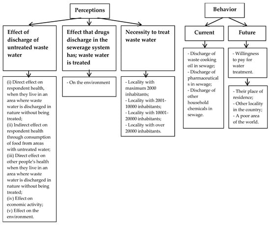 The study of perceptions focused on three directions. One was concerned with the effect of discharge of untreated wastewater, which was investigated in the following five situations: (i) direct effect on respondent health when they live in an area where wastewater is discharged in nature without being treated; (ii) indirect effect on respondent health through consumption of food from areas with untreated water; (iii) direct effect on other people’s health when they live in an area where wastewater is discharged in nature without being treated; (iv) effect on economic activity; (v) effect on the environment. These five directions were considered the most relevant ones based on the results of two focused groups, of 5 and 7 participants each. Answer options were arranged on 11 points Likert scale, as follows: “−5 (very bad), −4, −3, −2, −1, 0 (no effect), 1, 2, 3, 4, 5 (very good)”.