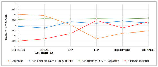 The evaluation of the alternatives using the PROMETHEE method in the 5th step provided an evaluation score for each alternative for the six stakeholder groups. The multi-actor view of the alternative configurations of the consolidated delivery is displayed in