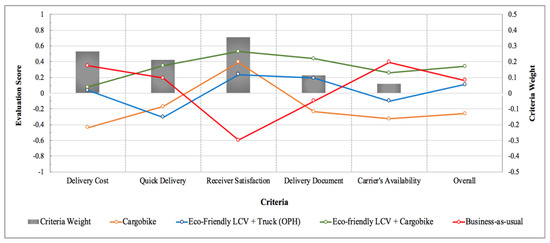 For the LSP group, the criteria weight of transport cost and delivery lead time were changed to reflect the higher value that freight carriers might place with respect to these criteria. For the receivers group, the criteria weights of delivery punctuality” and convenient deliveries were changed as some receivers might view on-time and convenient deliveries as important as cost of the delivery itself. For the shippers group, the criteria weights of delivery cost and receiver satisfaction were changed as some shippers might place relatively more importance on delivery cost than receiver satisfaction. However, the ranking and evaluation scores of the four scenarios did not change for these three groups.