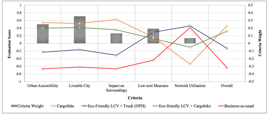 For the LPP group, the criteria weights of repair and maintenance cost”, location accessibility and harmonious integration were changed as some commercial property providers might not view the sustainable utilisation of the facility as important as efficiency and profitability of the facility. The only noticeable change was the slight drop in the evaluation score of “Cargobike” scenario. This could be attributed to the “Cargobike” scenario receiving the highest score for the harmonious integration criterion. For the local authority group, the criteria weights of low-cost measure and network utilisation criteria were changed as some local authorities might place more importance on the cost of the transport projects and enhanced utilisation of the transport network in their planning and decision-making. However, the ranking and evaluation scores of the four scenarios were consistent with previous results. For the citizens group, the criterion weight of the product availability” was changed to reflect the importance of product availability to other members in the citizens stakeholder group. There was a slight decrease in the overall evaluation score for the “Cargobike” scenario. This could be attributed to the concern that cargobikes might impact product availability.