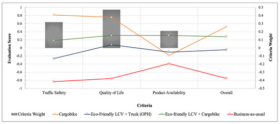 Figure 8 clearly illustrates the superiority of the “Cargobike” scenario in satisfying the objectives of the citizens stakeholder group. For the quality of life criterion, which was the most important criterion for this stakeholder group, this scenario achieved a very high evaluation score and was followed by the 3rd and 2nd scenarios. The views were similar for the traffic safety criterion, which was the 2nd most important for this group. The “BAU” scenario received a very low evaluation score for these two criteria as expected. Residents and workers prefer the consolidated delivery to be conducted with very limited presence of freight vehicles to enhance the amenity of the inner-city area. Furthermore, the mono-actor analysis revealed that the preference margin between the “Cargobike” scenario versus the 2nd and 3rd scenarios is quite wider than the results indicated by the other stakeholder groups. It was striking that the Cargobike scenario was ranked as the 3rd best scenario for the product availability criterion following the 3rd and 2nd scenarios. This suggested that this stakeholder group might believe it would be operationally difficult for freight carriers to maintain delivering products using only cargobikes. Similar to the local authority stakeholder group, the most preferred scenario for the citizen group was the “Cargobike” scenario followed by the 3rd scenario.