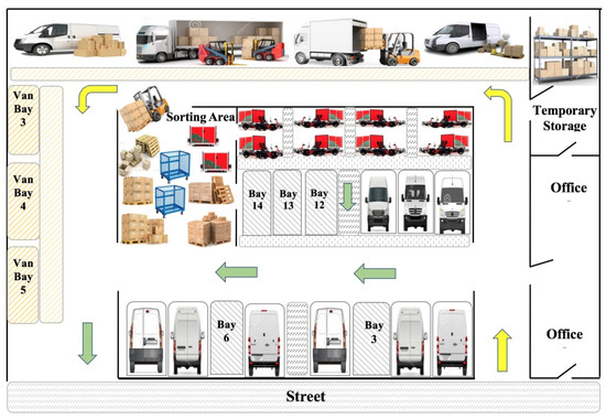 Figure 9 illustrates the proposed layout of the CF that incorporate the most optimal delivery configuration based on the MAMCA results. Furthermore, the proposed layout was discussed with experts from leading freight carriers to ensure reflecting the operational requirements and best practices of the freight industry. It is essential for the facility to have a high floor-to-ceiling height to accommodate receiving deliveries from participating freight carriers using articulated and heavy rigid trucks. It is recommended to separate the parking bays designated for freight vehicles of participating freight carriers from the loading bays of the CF BEVs and cargobikes. This facilitates easy ingress and egress and efficient traffic flow of the vehicles within the facility.