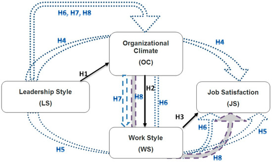 Leadership style and the organizational climate have been reported to positively and significantly influence employee satisfaction [55]. Priyankara et al. [56] reported on employees of textile and apparel manufacturing factories in Sri Lanka. Their findings indicate that the organizational climate is the partial mediator between leader’s support and employee behavior. Experimental evidence from the Alola, Avci, and Ozturen [14] study in Nigeria shows that work style mediates the relationship between leadership style and job satisfaction. In this paper, based on the previous findings, we made the following hypothesis for LS and JS with OC and WS as mediators for Mongolian register office employees.