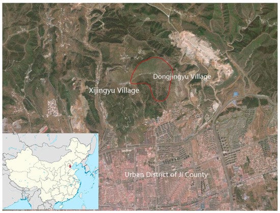 An aerial view is an important tool for designers. It provides evidence of the exact location of the project area, but mainly provides insights regarding the topography and morphology of the region under investigation. The red line defines the perimeter of Dongjingyu Village [37]. The box on the bottom left shows a map of China with Ji County marked in red, located between Beijing and Tianjin. Source: Wikipedia.