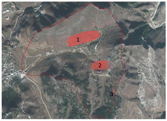 Aerial view of Dongjingyu Village modified from the ruins rebirth competition material [38]. The red solid areas identify the location and perimeters of the three project sites.