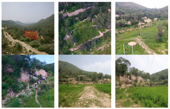 Six photos showing the landscape elements and patterns of Site no. 1, which is a flat ground area of 3000 sqm located near the Dongjingyu relic area. Walls and terraces in local stone entangled in thriving vegetation characterize the area with ruins.