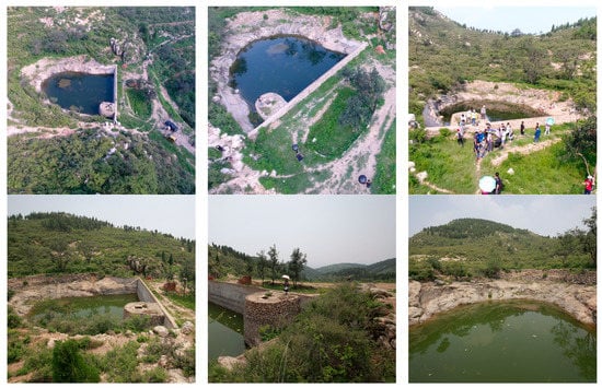 Six photos showing the landscape elements and patterns of Site no. 2. Site no. 2 is characterized by a reservoir and a platform. The area dimension is 2000 sqm, located to the south of Dongjingyu Village. Water, vegetation and open views toward the valley are the main landscape features of this site.