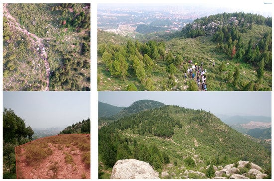 Four photos describing the landscape elements and patterns of Site no. 3. Site no. 3 is 1000 sqm and is located at a strategic point, with open panoramas toward the urban district of Ji County.
