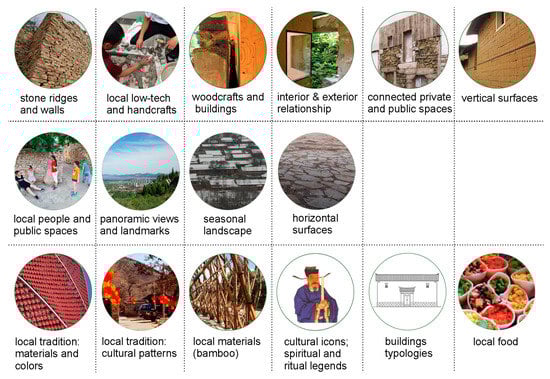 A transdisciplinary and international design team, composed of eighteen members including senior researchers, PhD students, practitioners and experts from both China and Italy, engaged in an international collaboration between the China Lab. for Architecture and Urban Studies at the Department of Civil Engineering and Architecture of the University of Pavia (Italy), and the Environmental Futures Lab. at the College of Design and Innovation, Tongji University in Shanghai. The pre-design phase began with a field trip to China at the beginning of summer 2016, and was organized for team design members to observe the dramatic rural transformations underway at various scales in the environment in and around the village. During the field trip, the design team, guided by Chinese PhD students, made analyses and collected data on the context and, when possible, conducted unstructured interviews with villagers. Unstructured interviews are useful when the identification of important concepts is one of the research aims, as in this project. Moreover, unstructured interviews allow researchers to ask relatively open-ended questions to discover interviewees’ perceptions on the topic of interest [39]. Design team members also attended seminars and exchanged ideas about sustainable development in rural areas with representatives from Tongji University as well as with planning experts. All the information collected provided the basis for the site evaluation, analysis of existing conditions and, mainly, the mapping of landscape patterns. Following the field trip, design team activities were structured around groups to systematize the fieldwork materials. Based on these findings, the researchers were able to make preliminary decisions about features, and then to define the new working HLE + LS framework for Dongjingyu Village. This framework is described in Section 3, and was incorporated into the design phase, described in Section 4. Using a photographic survey, along with the photographic material provided by the competition organizers, the landscape elements and patterns of the three sites, shown in Figure 4, Figure 5 and Figure 6, were described. Looking at the photographs, first-hand material, and the survey documentation (sketches, data, unstructured interviews, etc.), the researchers defined a matrix of landscape elements and materials, shown in Figure 7.