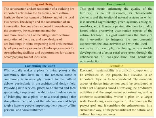 Taking in account the design aims defined above, the successful design should achieve a set of goals that embraces the three roles of the sustainable rural village: ecosystem, source of resilience, and services [44]. In other words, the overarching goals of a sustainable regeneration project at the village scale introducing new functions of hospitality for tourism are threefold, involving a qualifying relationship between human beings, the environment and cultural services.