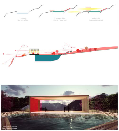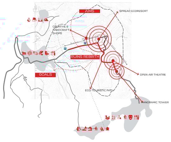 Working with the pre-existing context, using a sustainable approach that was able to highlight the potential still present in the architectural elements, the philosophy of this project was to find a cultural and social value even in the abandoned elements and in the ruins. Ruins are a reminder of architecture’s transience, but they also embody often-contested projections of meaning and memory [49]. Working with the iconographic value of architecture is a perceptual and cultural aspect that allows for some physical elements (be they buildings, paths, lights or monuments) to become components around which the community finds a sense of belonging and a collective identity. The elements that are always noticeable and draw the attention become the tools to achieve this goal.