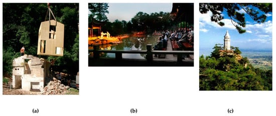 Finally, the design proposal for the panoramic tower on Site 3 should also be interpreted through the lens of the Chinese landscape iconography. The panoramic tower takes its shape and dimensions from the pagodas that are present in the landscape of the Ji County valley. The pagodas are always placed at strategic points on the top of hills or mountains overlooking the surrounding landscape. The most famous pagoda in the valley is the Mount Panshan scenic spot (Figure 11c). Thus, the panoramic tower is a re-interpretation of the Chinese landscape iconography that bolsters the identity of the inhabitants. Moreover, the panoramic tower was designed with a main structure out of bamboo, which is a local material and a well-known construction material used by local craftsmen. The internal structure is a staircase in recyclable steel. The foundation is the only part in concrete.
