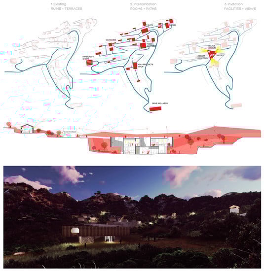 The project was developed through an iterative process of landscape and architectural design that aimed to regenerate and transform the village for uses that are suitable for contemporary ways of living, while encouraging the coexistence of villagers and the growing tourism industry. Using the research by design process, along with the scientific resources from landscape science, the authors defined a research framework that combines the site resources (natural resources, landscape, artifacts such as ruins, walls, etc.) with the “landscape service classification” and “historical landscape element (HLE) types and categories”. Applying this research framework was a necessary shift in thinking in order to boost the main goal of landscape design and planning toward the inclusion of citizens as active agents throughout the entire process, rather than focusing on the provision of opportunities for participation. Hence, two results were demonstrated: (1) Sustainable village regeneration that considers bioclimatic requirements can only be achieved with a supportive and cooperative citizenship. The new rural landscape development required by contemporary social challenges will be a place without power hierarchies, a place of equal opportunities and cooperative citizenship. (2) The village becomes an expression of social and individual events. During this project, the emphasis was placed on displaying the expression of social, individual or complementary events that enable mutual performance in place and time. Finally, the relationship between nature and the environment is directly entangled in a form of mutual exchange and hybridization, we therefore aim to create reconciliation between traditional material production, nature and landscape.