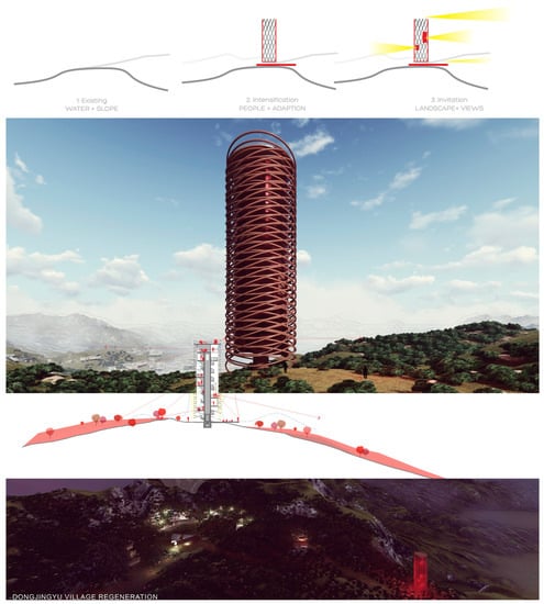 The aim of the project was not limited to the three areas—it aims to expand its benefits into a wider territory. The integration between the project and the context is not limited to functional and organizational/productive aspects, but it aims to go as far as the iconographic and perceptual levels allow. The new architectural vertical panoramic tower, with its bamboo structure, is an iconic element that will be perceptible from the entire intervention area, as well as from the surrounding Ji County valley, becoming a “landscape attractor” node that connects the landscape physically and visually. The lightweight bamboo structure will host cultural activities for the promotion of an ecologically-sustainable life committed to wellness. A diagram, drawings and 3D views are presented in Figure 14.