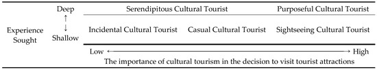1], the four previous types, excluding the “Serendipitous Cultural Tourists”, make up both of the cultural tourists. Even if tourists visited the site for the purpose of cultural tourism, when the main goal of tourism is day-to-day escape or pursuit of pleasure, “Sightseeing Cultural Tourists” are more common than “Purposeful Cultural Tourists”.