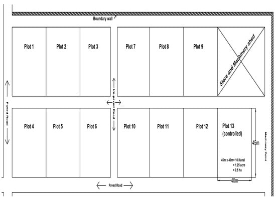 The area of 6.58 hectares (16.25 acres) was divided in 13 plots of 0.5 ha (45 m × 40 m) each. 12 were sown with a water seed drill, and the 13th plot by conventional methods, as shown in Figure 2. The sowing operation was performed with a forward speed of 4.25 km/h and a maximum water flow rate of 90 mL/s (90, 70, and 50 mL/s), based on the existing moisture content in the soil, while the conventional plot was sown at same speed, with no water application. The data for moisture content (%), germination count (GC/m2), number of tillers (tiller/m2), and wheat yield (kg/ha) were collected. A wheat yield comparison for the last 17 wheat seasons from 2000-2001 to 2016-2017 was also performed.