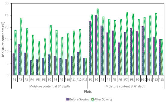 The moisture content in the field was measured at two different depths, i.e., 3 and 6 inches, both before crop sowing and after the sowing of the crop with the water seed drill. The average moisture content in all plots was enhanced by the operation of the water seed drill, i.e., 18.3% soil moisture content at 3 inches, which was twice that of the already existing average soil moisture content in the same plots (9.12%), as shown in Figure 3.