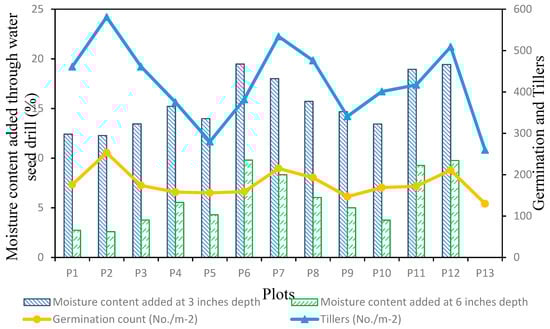 Data concerning the number of tillers in accordance with moisture content at two depths, i.e., 3 and 6 inches, are presented in Figure 5. The figure depicts a trend of the moisture content added to the existing soil moisture through the water seed drill at both depths and its ultimate impact on the tillers. The analysis of data clearly showed that a maximum number of tillers (tillers·m−2) of 581 was recorded in the plots sown with the water seed drill, while the lowest number of tillers was recorded at 260 in the plots sown with the conventional seed drill. The difference in the number of tillers in the plots sown with the water seed drill and that of the conventional seed drill was 321 tillers. The plots with higher soil moisture content had a larger number of tillers. Moisture stress directly affected the development, growth, and yield of a crop, and the results were similar to those reported by [33].