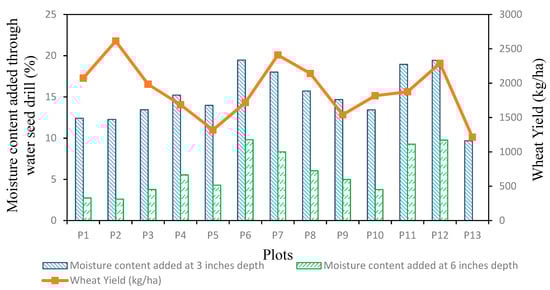 Figure 6 depicts the trend of moisture content added through the water seed drill in the field at both 3 and 6 inches of depth and the impact on wheat yield. The data showed that the maximum wheat yield produced was 2613 kg/ha in plot 2, followed by 2410 and 2290 kg/ha in plot 7 and plot 12, respectively, while a minimum yield of 1214 kg/ha was observed in the plot sown with the conventional seed drill. [34,35] reported that moisture content has a direct relationship with crop growth, the number of grains per spike, and the ultimate wheat yield. [36] states that the average grain weight per spike is 2.17 g.