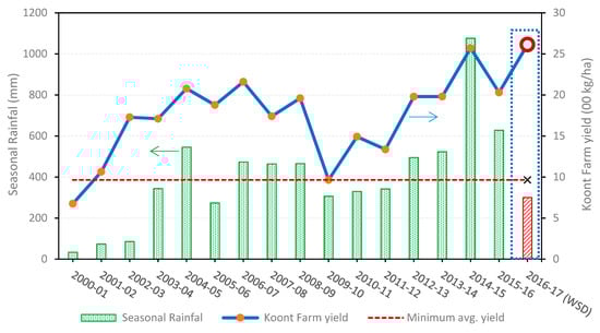 A comparison between the wheat yield and seasonal rainfall for 17 wheat seasons from 2000-2001 to 2016-2017.