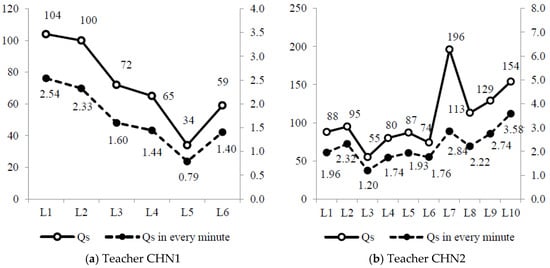 The number of questions asked by both teachers varied substantially from one lesson to another across the lesson sequence. Figure 2a,b show the total number of teacher questions in one lesson and the average number of teacher questions in each minute in the classes of the teacher CHN1 and CHN2. Both numbers experienced an overall falling trend across the lesson sequence taught by the teacher CHN1. Over the lesson sequence, she tended to ask fewer questions in the later lessons than in the earlier ones.