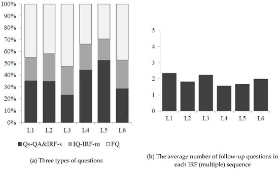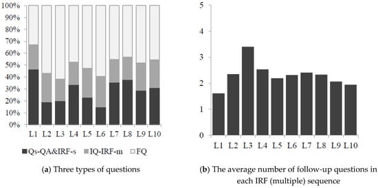 Figure 3a shows the distribution of questions in three occasions, namely, (1) Q&A pairs and IRF (single) sequences, (2) an initiation phase of the IRF (multiple) sequences, and (3) a follow-up phase of the IRF (multiple) sequences.