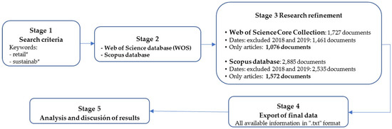 33]: (1) define the search criteria, keywords and time periods; (2) selection of scientific datasets; (3) adjustment and refinement of research criteria; (4) full export of results; and (5) analysis of the information and discussion of the results (