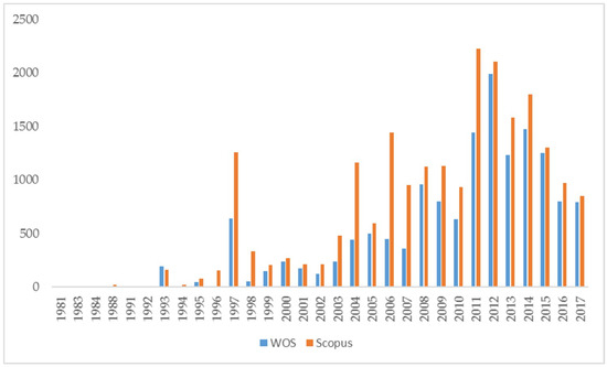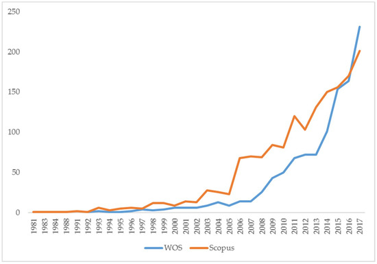 36]. WOS is a multidisciplinary database which mainly records scientific articles, reviews, and books (also other documents such as meetings, editorials, or letters). WOS is the most commonly used database, generating useful information for researchers evaluating scientific activity. It is also considered a good option due to its multidisciplinary character, the ability to filter searches using several bibliographic parameters, and because it provides easy access to the full texts of the searched papers. Scopus was developed in 2004 by the company Elsevier Science and it is a comprehensive scientific, medical, technical, and social science database containing all relevant literature. Some studies compare both databases [