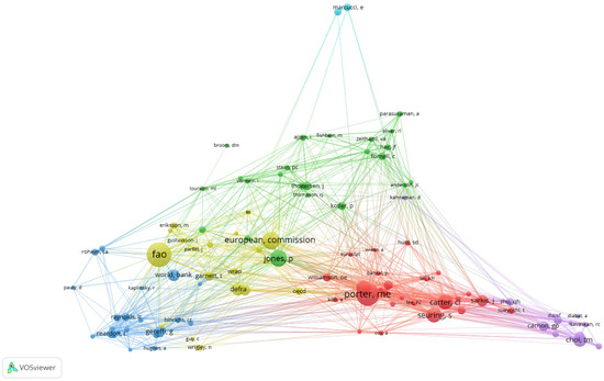 Cluster 4 (light green), composed of 19 authors and institutions, has two main entities leading the group, FAO (Food and Agriculture Organization) and European Commission. This cluster is mainly focused on food, on matters such as: sustainability in the global food system; developing sustainable food supply chains; quality, safety, and sustainability in food distribution; development of measuring methods for environmental sustainability in food production systems; or drivers for sustainable food retailing. Another issue of interest to this group is related to the European Union, researching on sustainable retail supply chain in Europe, such as: European retailers as agents of change towards sustainability; private eco-brands and green market development; or analyzing retailers’ sensitivity to local sustainability policies. Other institutions are also part of this cluster, for example: United Nations, UNEP (United Nations Environment Programme), OECD (The Organization for Economic Co-operation and Development), and WRAP (Worldwide Responsible Accredited Production).