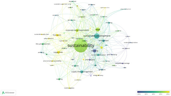 Figure 9). This map is based on the average publications per year and uses different colors to highlight the most employed author keywords in each of the last years. The most recent keywords are marked in yellow, so the most important trends may be identified. Nowadays, research on sustainability in retailing focus on topics such as supply chain and sustainable supply chain, or reverse logistics. The other important emergent subject in retailing is food waste and the efficient management of supermarkets. Other emergent topics regarding retailers are environmental sustainability, carbon footprint, corporate social responsibility, and the triple bottom line.