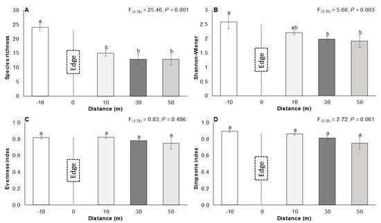 Comparison of indices of diversity (a—species richness, b—Shannon-Wiener, c—evenness index and d—Simpsons index) at various sampling distance from the natural/old field edge. Data are means ± SE and significant ANOVA results are shown.