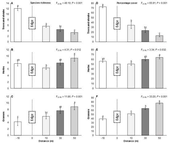 Comparison of species richness (A–C) and vegetation cover (D–F) for trees and shrubs, herbs, and grasses at various sampling distance from the natural/old field edge. Data are means ± SE and significant ANOVA results are shown.