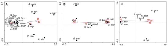A list of the 36 plant species that were identified at various distances from the natural/old field edge are presented in the Appendix A (Table A1), with their occupancy frequencies shown. Correspondence analysis for trees and shrubs showed that most species assembled in the natural areas, 10 m from the edge (Figure 5a). However, the woody species of Peltophorum africanum, Senegalia nigrescens, S. senegal, Vachellia tortilis, V. nilotica, V. karroo, and Lippia javanica appeared at all measured distances from the edge, but their occupancy frequencies in the old fields decreased with an increase in distance from the edge (Figure 5a). Correspondence analysis for herbs showed that the species Felicia sp dominated 10 m into the natural area from the edge, whereas Solanum panduriforme and S. incanum dominated 10 m into the old field. The herb species of Xerochrysum bracteatum, Gomphrena celosioides and Datura stramonium assembled 30 m and 50 m into the old field from the edge (Figure 5b). Correspondence analysis for grasses showed only two distinct groups, where Aristida congesta, Digitaria eriantha and Eragrostis inamoena assembled 10 m into the old field from the edge and Panicum maximum, Cynodon dactylon and Eragrostis lehmanniana assembled 30 m and 50 m into the old field as well as 10 m into the natural area from the edge (Figure 5c).