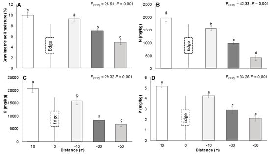 Generally, measured soil parameters decreased with an increase in distance from the edge into the old fields. Gravimetric soil moisture was significantly (P < 0.001) higher 10 m into both the natural and old fields from the edge compared to 30 and 50 m into the old field from the edge (Figure 6a). All measured soil macro nutrients of total N, C and P significantly (P < 0.001) decreased with an increase in distance from the edge into the old fields (Figure 6a–d). However, for soil C and P, there were no significant (P > 0.05) differences at 30 and 50 m distances from the edge into the old fields (Figure 6c,d).