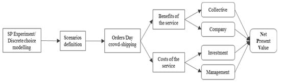 The methodology architecture is reported in Figure 1. The first step is to define possible crowdshipping demand levels as a function of the main features of the service. Second, the demand is converted into orders, and the vehicle-kilometers saved by public transport-based crowdshipping are computed. Finally, the benefits and costs of the service are evaluated in terms of externalities reductions, revenues, investment, and management costs, thus computing the net present value of the proposed service.