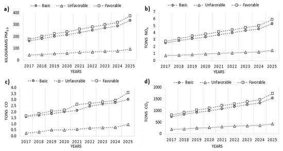 Below we report the environmental-related benefits for the 2017–2025 period, based on the above assumptions, for the implementation of a crowdshipping service in Rome (Figure 2).