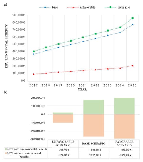 Without considering public benefits, the NPV obtained is negative, underlining that costs prevail over revenues for the platform operator (Figure 3). However, considering that environmental benefits and accident reduction impact on society as a whole, it is reasonable to suppose that their economic value can be converted into public incentives and, therefore, be deducted from the total costs of the platform. Following this assumption, the NPV takes a positive sign, indicating the economics as well as the environmental sustainability of the platform during the eight years has been considered.