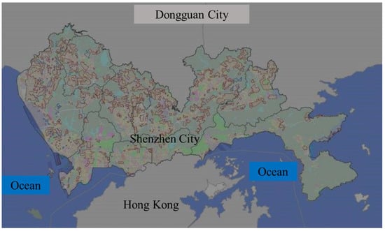 As mentioned before, urban villages are widespread in rapidly developing cities in China. As one of the most prosperous cities, and also as a Special Economic Zone in China, Shenzhen is a typical dual-structured city with informal urban villages and formal residences co-existing for more than thirty years. Shenzhen has experienced a significant growth in population from 0.31 million since its establishment in 1979 to 12 million in 2016, about 7 million of whom live in urban villages predominately because of the low rent. This generates large demand for PT travel either for commuting or for non-commuting activities [35]. Figure 1 demonstrates the extensive distribution of urban villages in Shenzhen covering almost 60% of the built-up areas of the whole city. Taking account of these characteristics, we selected Shenzhen as our case study area.