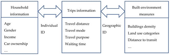 The integrated dataset in this research included not only the 2014 Shenzhen Household Travel Survey, which recorded individual, household, and travel information, but also the 2014 Shenzhen Land Use data and 2014 Shenzhen Construction Census as well, from which the built environment information could be extracted. This information was integrated as shown in Figure 4.