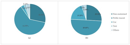 Demographic and socioeconomic variables play critical roles in the mode-choice decision process made by travellers. A different segment of the population of different age, gender, education, income, and employment make a different travel mode choice [13,14]. Besides, household socioeconomic characteristics, such as car ownership, household size and structure, as well as household income, also significantly influence traveller mode choice [15,16]. For example, men are more likely to travel by car in commuting activities, while when it comes to shopping activities, women are more prominent car travellers [17]. Regarding employment, compared to the unemployed, the employed make a large proportion of car trips in spite of making fewer total trips [18]. Also, low-income groups have been claimed to have low mobility, but are more likely to use PT or a non-motorised mode [19].