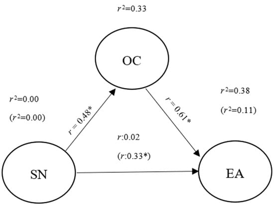 The bootstrapping approach is used to check the indirect effect of SNs on EA through OC. The results show that the path from SNs to EA is reduced in absolute size (from 0.33 to 0.02) and statistically becomes insignificant when the mediator is introduced. In addition, the t-value in the direct effect between IV and DV is not significant (<1.96), which is inconsistent with mediation. Instead, this is a case of spurious relationship (A ‘spurious relationship’ is a statistical term in which two or more constructs or variables are not causally associated with each other. However, it may be incorrectly concluded that they are, due to either coincidence or the presence of a particular third, unseen factor (referred to as a “confounding factor”). As such, an exploratory test for OC-->SNs -->EA was performed. However, the spurious relationship was not observed.) between SNs and EA. In this case, although SNs-->EA is positive and significant, Hypothesis 1 cannot be approved.