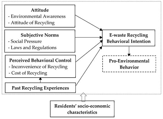To clarify antecedents and drivers that motivate individuals to recycle solid waste, recent studies have employed theory of planned behavior (TPB) and focused on the impact of motives namely attitude, subjective norm, and perceived behavioral control on recycling behavior [23,29]. Moreover, several other studies have emphasized the important impacts of situational factors such as past experiences and cost of recycling on household waste recycling behavioral intention [30,31]. However, it seems to be that few studies conducted by exploring the influences of these combined factors on e-waste recycling behavioral intention. Consequently, the need for a more comprehensive picture drawing on related influencers is crucial, which can provide both decision-makers and agencies with an in-depth understanding that can be used to enhance recycling rates.