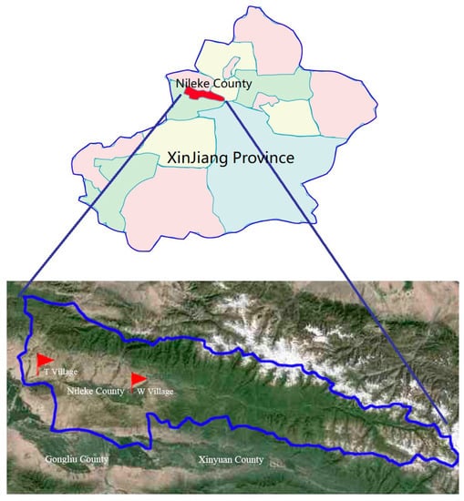 We selected two case study villages, T Village in the western part and W Village in central Nileke County (Figure 1). In 2015, there were 423 households with 1803 people in T Village, and Kazakhs accounted for more than 90% of the population (village statistics). Natural pasture area was about 10,667 ha, divided into three seasonal pasture areas: spring-autumn, summer, and winter pasture. Farmland area is about 720 ha. W Village had 558 households with 2273 people, of which 50% were Kazakhs. Natural pasture area is about 9333 ha, also divided into three seasonal pastures. Farmland area is about 504 ha. The main cash income for agro-pastoralists is from livestock sales rather than agriculture.