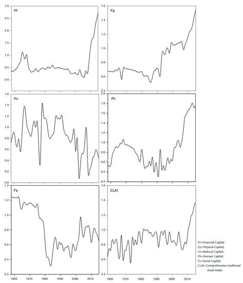 Factor analysis was applied to the 22 financial, physical, natural, human and social capital indicators to reduce the specific, observed indicators to a smaller number of categorical common factors (F). The four original indicators of financial capital were replaced by two common factors (Ff1, Ff2), covering 96.80% of the original variable information. Agricultural output per capita, loans and deposits per capita are closely correlated with Ff1, while livestock per capita is closely correlated with Ff2. So Ff1 mainly represents economic activity in cash, and Ff2 represents livestock capital, which was the most important determinant of wealth for agro-pastoralists. The two financial common factors (Ff1, Ff2) were combined into Ff according to the variance contribution rate. The five original indicators of physical capital were replaced by one common factor (Fp), covering 83.59% of the original variable information. The four original indicators of natural capital were replaced by one common factor (Fn), covering 74.74% of the original variable information. The five original indicators of human capital were replaced by one common factor (Fh), covering 85.46% of the original variable information. The four original indicators of social capital were replaced by one common factor (Fs), covering 84.51% of the original variable information (Table 4).