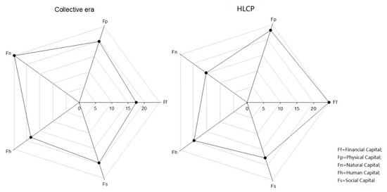 The score coefficients of the common factors Ff, Fp, Fn, Fh, and Fs were shown in Table 6. In financial capital, livestock capital had the greatest influence on Ff during the Collective Era, during which time loans and deposits were uncommon. However, in the HLCP, the influence of livestock capital became the weakest influence, and cash capital such as loans and deposits played a bigger role in agro-pastoralists’ financial livelihoods. In physical capital, rural construction area, family fixed investment and agricultural machinery had significant influence on Fp in both periods. Tap water and canal construction were increasingly important in the HLCP, as part of the development of irrigated agriculture. In natural capital, pasture area had the largest influence on Fn over both periods, but the influence of NPP decreased in the HLCP. In human capital, the influence of education on Fh increased significantly in the HLCP, while the influence of the size of the labor force decreased. Non-agro-pastoral labor had relatively small influence on Fh, while the ratio of pastoral labor to agricultural labor played a key role. In social capital, all four indicators were similarly influential on Fs. Government officials’ population (the scale of government officials in total population, which reflects administrative influence on social management) was the most influential indicator during the Collective Era, while the rural Gini coefficient became the biggest influence in the HLCP. Agro-pastoral cooperation was an important indicator over both periods.