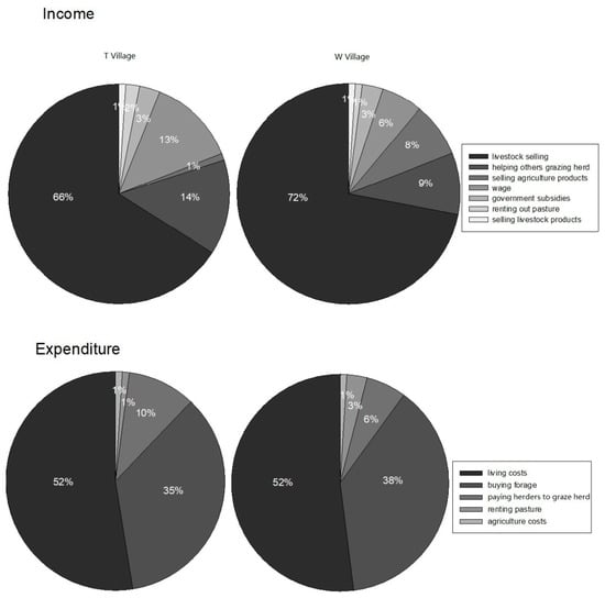Financial capital significantly increased over time, partly reflecting increased household income. The main source of income for all households in the two villages was livestock sales. In the years we conducted the survey, livestock income accounted for 66% and 72% of the total income in T Village and W Village, respectively. Other sources of income included renting grazing land and labor, selling livestock products such as milk and wool, government subsidies, and wage work (Figure 4). Only 1 household earned a majority of income from farming (by renting 240 ha of farmland to grow high-value medicinal herbs). For most households, the area for farming was too small and common crop prices too low. 52% of families claimed to be poor families with less than 50 livestock, and 3 households with no livestock rented out their pasture. Livestock ownership was limited by availability of herding labor and episodes of financial problems that forced selling off herds. Major household expenditures were living costs (52%), including weddings and medical fees. Production costs accounted for 48% of household expenditures, and livestock costs such as buying forage, paying herders to graze herds, and renting pasture were significantly greater than agricultural costs (Figure 4). The significant rise in Ff around 2010 (Figure 2) correlates with the onset of home and barn construction, instigated by nomad sedentarization schemes. House and barn construction were paid for with bank loans, the first time that formal credit was used by most households. The use of winter pen/barn feeding required the purchase of additional fodder, which was also often paid for with bank loans. The sedentarization program thus stimulated an initial debt and subsequent annual debts. The continuous increase in Fp and Fh were also attributed to the influences of private production and sedentarization programs, which promoted production facilities and primary school construction, increasing the educated labor supply.