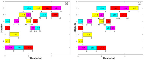 | Step 2 | Analyze the genes successively, and determine the value of Sij. For the gene (i, k) representing Oij, ASij is non-negative, and based on Constraints (14) and (15), , k, q:, . Check the operations performed on machine k that have already been analyzed and obtain all idle ranges [IT_S, IT_E]. Then, check each idle interval [IT_S, IT_E] successively, if max{ASij, IT_S} + TPijk ≤ IT_E, Sij = IT_S and the value of related should be changed according to new order; otherwise, check next idle range. When Oij cannot be inserted into any idle range, Sij will take the maximum of ASij and the end time of the immediate predecessor of Oij on machine k according to Constraint (12) along with (13). |