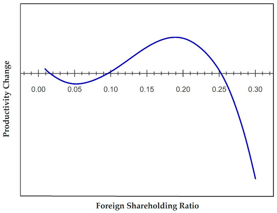 As mentioned earlier, there is an inverse N-shaped relation between foreign shareholding ratio and productivity growth of China’s banks. As shown in Figure 1, there are two inflection points which are 5.11% and 20.16%, respectively. The two inflection points mean that the productivity growth of China’s banks would reach a minimum when the foreign shareholding ratio is 5.11%, and reach a maximum when the ratio is 20.16%. Figure 1 also shows that bank productivity growth decreases when the foreign shareholding ratio is lower than 5.11% or higher than 20.16%, and increases when the ratio is between 5.11% and 20.16%. This implies that when the foreign shareholding ratio in China’s banks increases to within the range, i.e., 5.11% to 20.16%, the foreign strategic investment contributes to maintaining continuous growth in the productivity of China’s banks. Thus, to achieve sustainability, domestic bank managers should maintain a foreign shareholding ratio in the range of 5.11% to 20.16%.