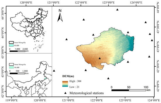 The Horqin Left Wing Back Banner (121.5° E–123.7° E, 42.7° N–43.7° N) is located at the southeast side of the Horqin Sandy Land (Figure 1) and covers an area of 11,476 km2. HLBB is a typical semi-arid sand area with dry and windy conditions in spring. The average annual precipitation is approximately 350–450 mm, and approximately 70% of the total annual precipitation is concentrated from July to September [29]. The local terrain consists of flat to undulating sand and plains (Figure 1). The topography of HLBB is dominated by sand dunes but also contains alluvial valleys and flat sand. The main soil types include aeolian sandy soil, meadow soil, alkaline soil, and marsh soil, each accounting for approximately 68.9%, 23.1%, 7.2%, and 0.78%, respectively. The surface layer of sandy soil is structureless and is accompanied by coarse sand, which is extremely erosive [30]. HLBB is also a typical agro-pastoral area in northern China. The vegetation community is dominated by secondary grassy plant species and sparse shrubs. Trees can only be found in artificially planted economic forests and windbreaks. Grazing and farming are the traditional land use types with distinct boundaries between cultivated land and pasture land (Figure 2). The desertification is more severe in pasture-dominated central and western regions. The areas with relatively low wind erosion are the eastern plains that are dominated by cultivated land and the Daqinggou nature reserve with high forest cover in the southwest region [31].