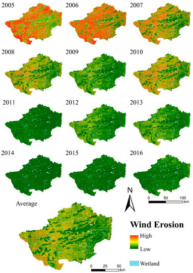 3.1. Temporal–Spatial Changes of Wind Erosion from 2005 to 2016